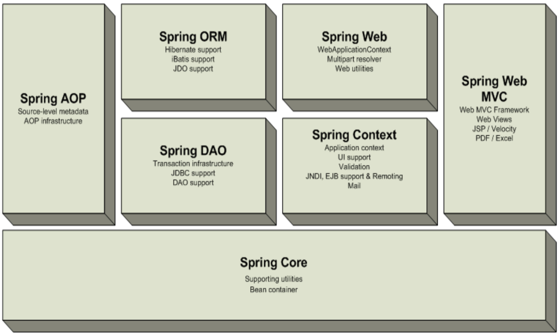 - Spring Context: Spring Core의 기능 외에 추가적인 기능들을 제공하며 JNDI, EJB 등을 위한 Adaptor들을 포함